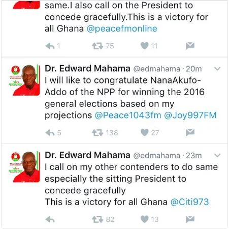 Reports from Ghana says Dr Edward Mahama, the presidential candidate of People's National Convention in the 2016 Presidential elections has conceded defeat even as the Ghana’s electoral commission is yet to conclude vote count.